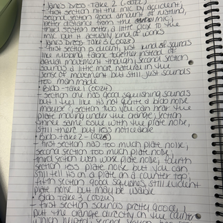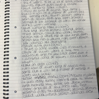 I read through the manual and did some Googling, and ended up getting enough of the basics that I felt confident going forward to record. I was definitely still intimidated by all of the functions and didn't dive any deeper into it than getting the basics of what I needed done, but I don't think that was expected of us and I got everything done that I needed to do. I ended up splitting the recording into two days. I kept track of everything by making notes of what each sound was, which file number it was, and made notes of how I felt about each sound. (I'll include photos of my notes below. I was going to type them all out but in reality they weren't really for anyone but me so I could figure out what I was doing.) Day one was a success, but not without its trials. One of the hardest lessons I learned was making sure that the Tascam was recording. Apparently when you press the record button only once, it sets itself up to start recording, and then requires a second press to actually record. Frustratingly, I had several really good takes, and of course they weren't recorded. I tried to look at the silver lining of calling it practice. Another thing I noticed while playing the recordings back, was that it was only playing out of the left speaker. The reason for this, which I later was told during the Support session, was because I had recorded in stereo but it was an easy enough fix to change the recordings to mono, thankfully. I will say, please excuse my absolutely atrocious handwriting. Everyone thinks because I'm a tattoo artist I'd have great handwriting, and I've had clients say, "Just write it out yourself." Yeah. No. You don't want those kinds of problems, buddy.